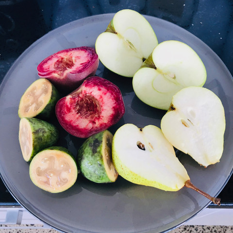 When we got back, we set up the bean bag chairs to face the ocean and I cut up some fruit: two delectable native feijoas and an apple, a pear, and the brightest-flesh peach from the property’s mini orchard (I think it has 10-15 trees).